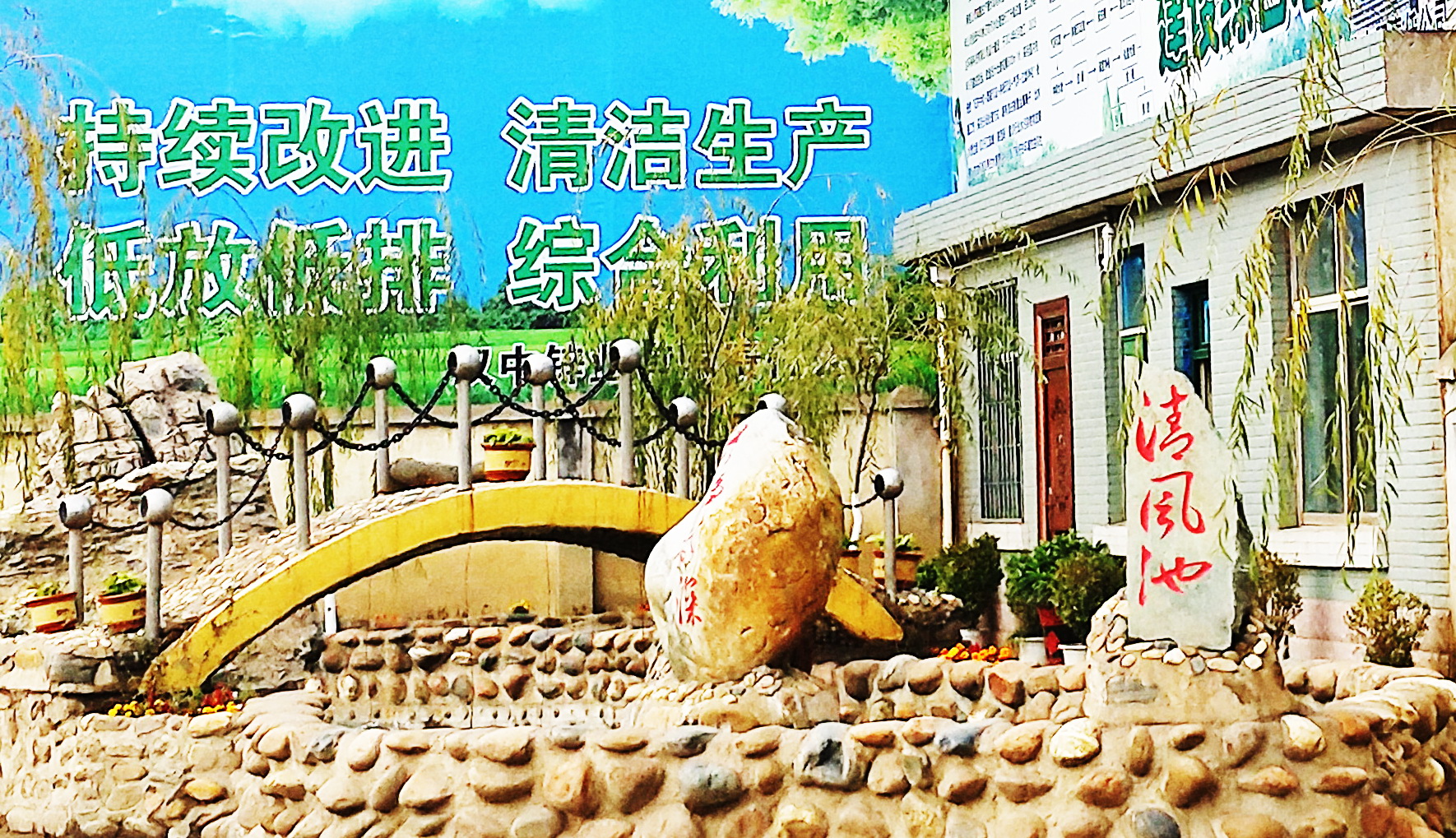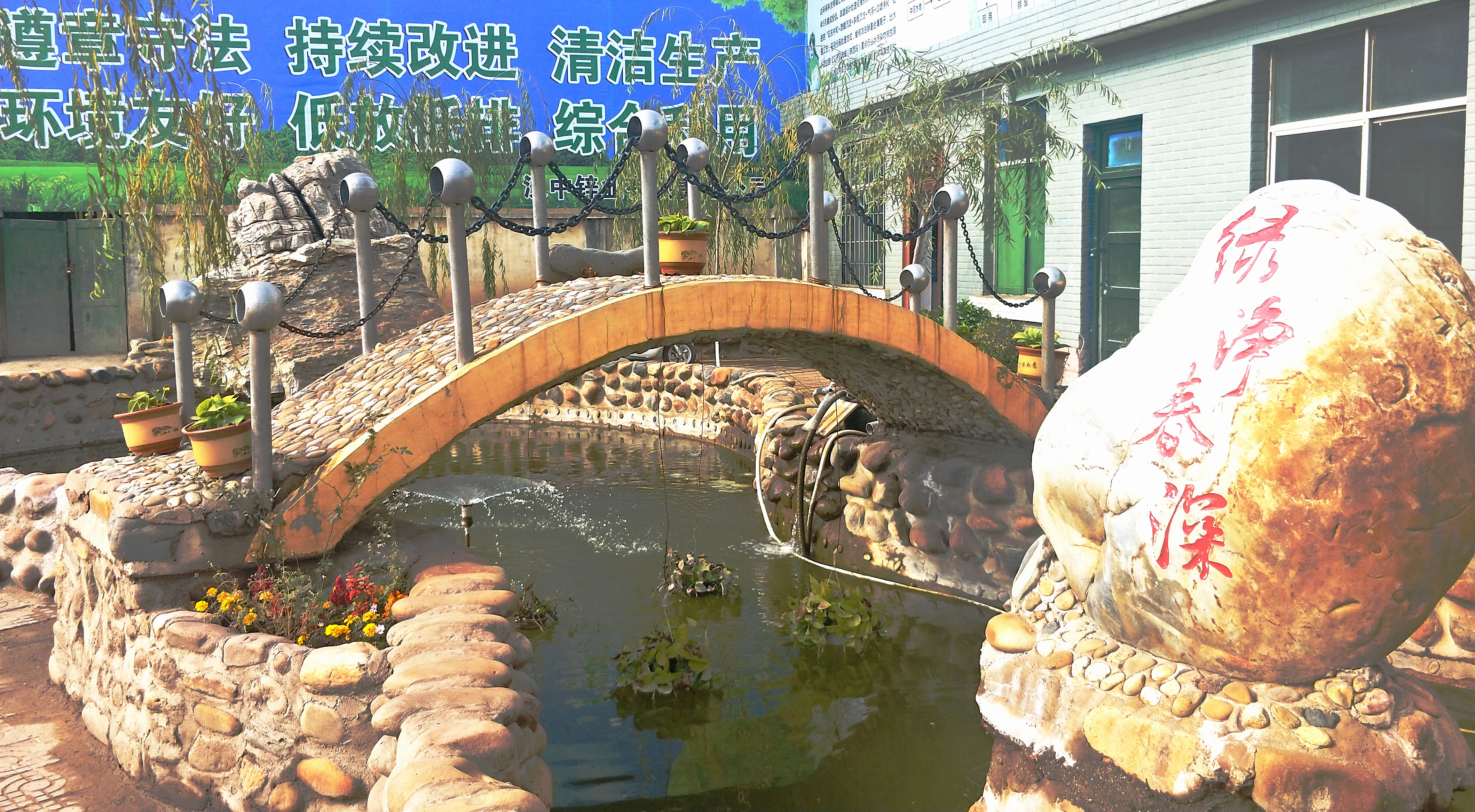最吸引眼球的莫過于車間辦公室前面的小花池了!形色各異的石頭砌就的圍堰獨具特色,碧綠的池水上架著一座微型拱橋,廢舊物料制作的銀白色立柱、圓球形套環與黑褐色鐵鏈組成的安全護欄,一下子把小橋裝扮得韻味十足。兩塊形態獨特的文化石屹立在池水中,一塊寫著“清風池”,另一塊寫著“綠凈春深”;水面上的噴頭如一朵小蓮花正吐露著銀色的水花;難得的暖陽灑向水面,紅色、黃色、銀白色的小金魚聞聲成群結隊地向我們游來,不時激起一圈圈漣漪。“清風池”上微風徐來,“綠凈春深”意境悠遠,怎一個美字了得?不由得讓人駐足觀望,仿佛自己走進了鬧市中公園一角。