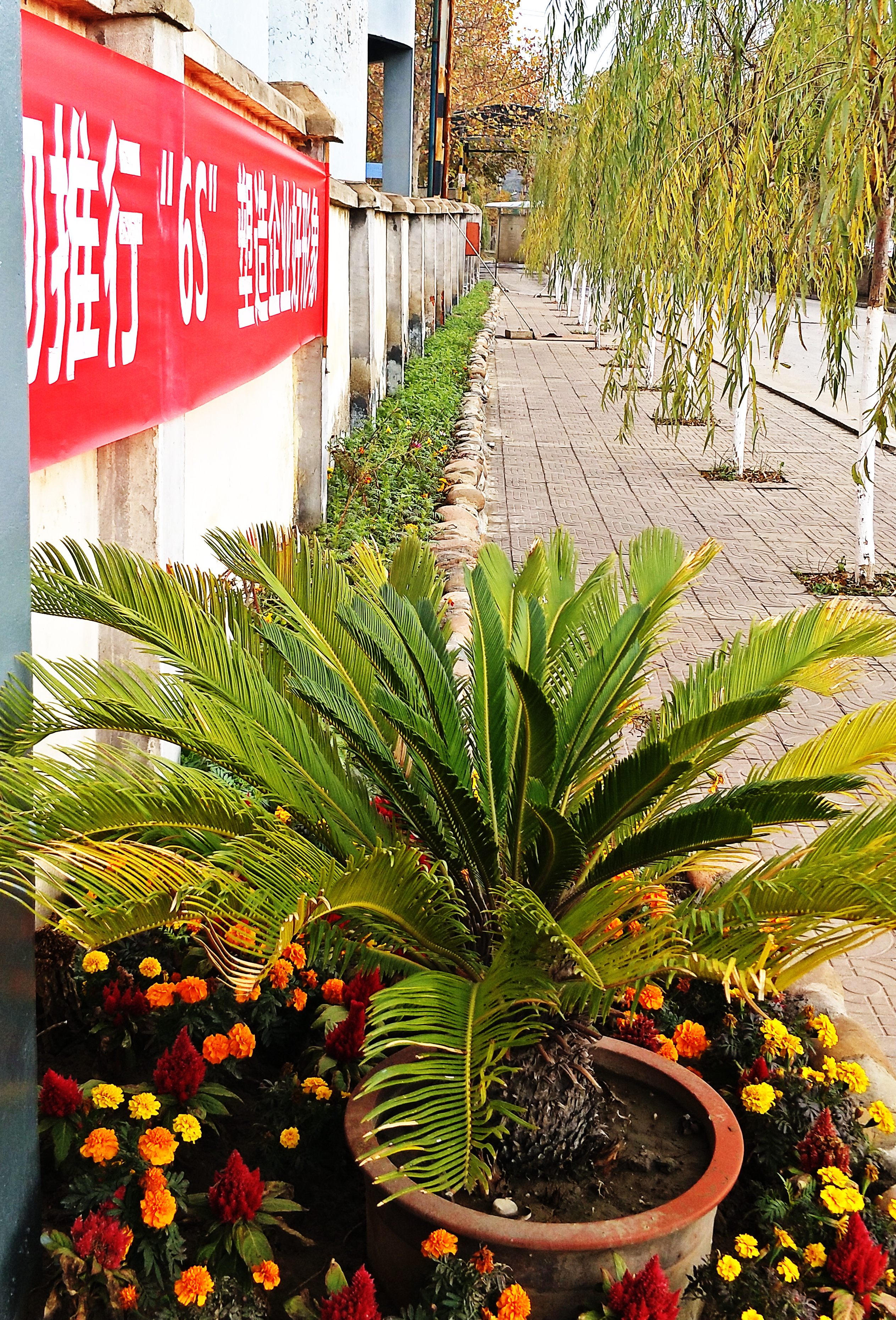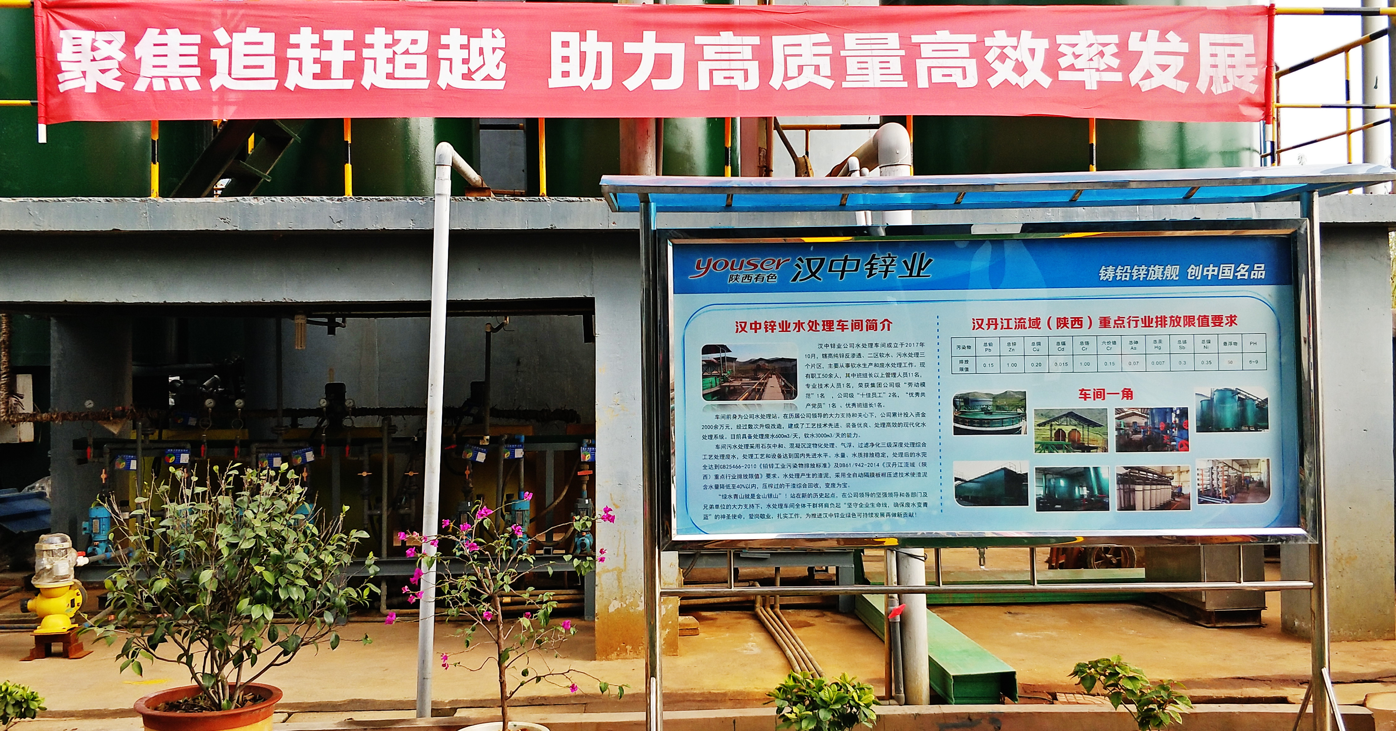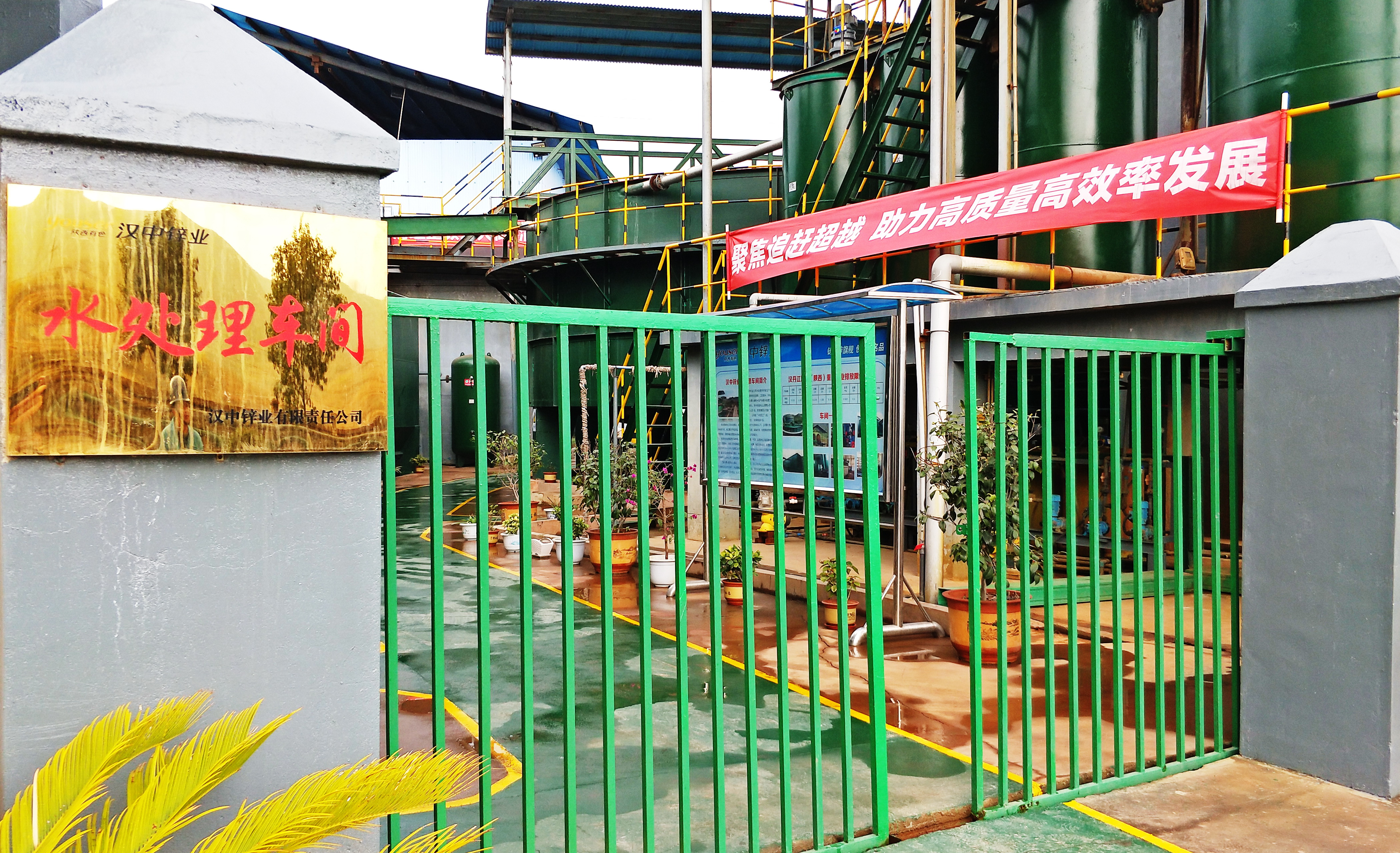 然而,當我們走進漢中鋅業公司水處理車間,奪目而入的景色卻令人眼前一亮:一字排開的垂柳,枝繁葉茂,黃綠相間的枝葉在冬日暖陽下翩翩起舞。沿圍墻新砌的小花池綠意盎然,大門旁的兩棵鐵樹在花團錦簇的萬壽菊簇擁下,生機勃勃。剛刷過漆的綠色柵欄式推拉門與金光燦燦的“水處理車間”銅字招牌相得益彰,熠熠生輝,關不住滿園景致,綠色的設備,綠色的通道,黃色的邊界線,擺放整齊的盆景,醒目的巨幅宣傳牌、宣傳橫幅、櫥窗,洋溢著濃厚的文化氣息。
