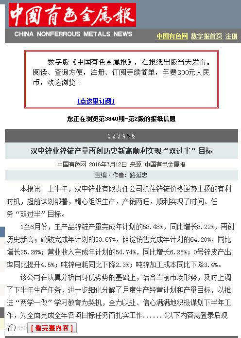 陜西國資委網站、中國有色報:漢中鋅業鋅錠產量再創歷史新高 順利實現“雙過半”目標