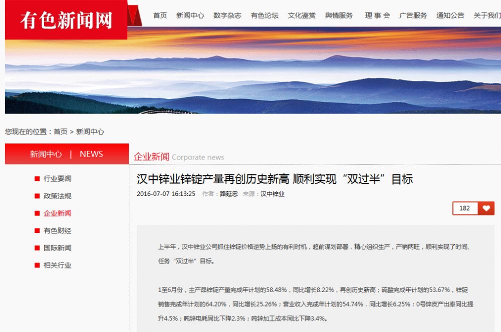 有色新聞網:漢中鋅業鋅錠產量再創歷史新高 順利實現“雙過半”目標
